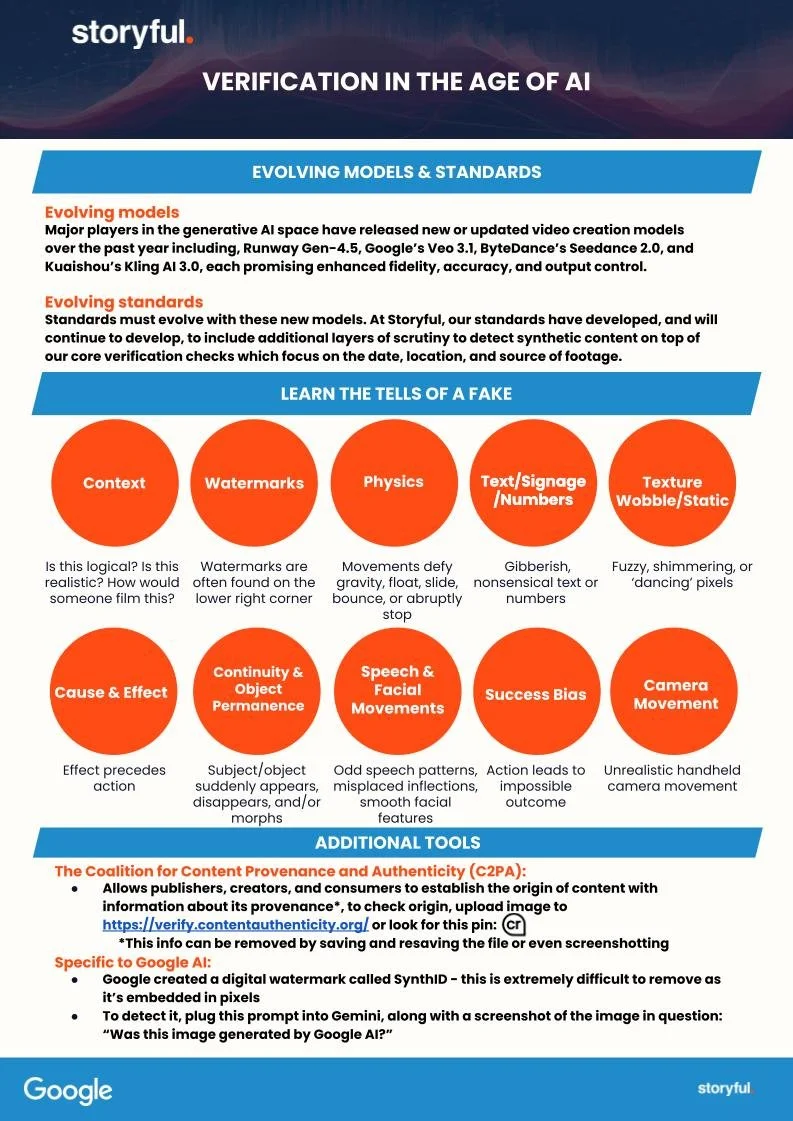 In association with the Google News Initiative, I led a seminar teaching a group of newsrooms how to spot synthetic content in our evolving media landscape. Below is a one-pager I developed which was given to participants following the training module.